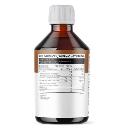 - Источник среднецепочечных жирных кислот MCTs (medium-chain triglycerides) - одна порция добавки содержит 12 г жиров, включая, в частности, каприновую или каприловую кислоту.
