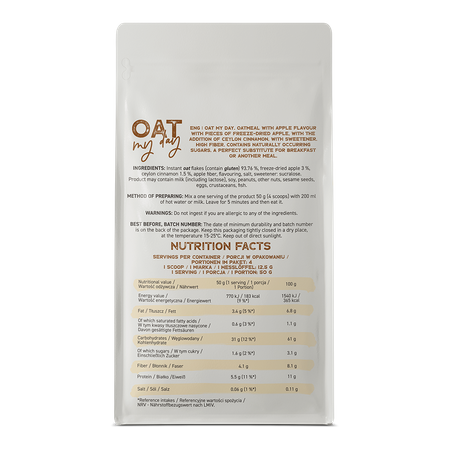 OstroVit Oat My Day это питательная овсянка, которая отличается богатством пищевых волокон. Продукт не содержит добавленного сахара и своим сладким вкусом обязан кусочкам натуральных, сублимированных фруктов и низкокалорийному подсластителю сукралозе. Доступная в четырех разных вкусах, смесь является решением, которое удовлетворит аппетит и индивидуальные предпочтения потребителей, а удобство и короткое время приготовления позволит насладиться вкусной и полезной закуской даже в течение напряженного дня.