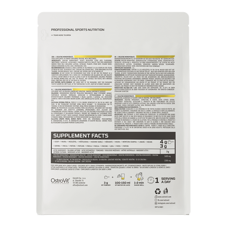 В препарате OstroVit используется моногидрат креатина, т.е. соединение молекулы креатина с молекулой воды в одну молекулу - так как креатин является гидрофильным соединением, он легко соединяется с водой и поэтому является веществом с отличной биодоступностью. Моногидрат креатина является структурно самой простой формой креатина, а также наиболее популярным среди спортсменов соединением - он идеально подходит как для начинающих спортсменов, занимающихся активным образом жизни, так и для профессионалов, благодаря тому, что креатин повышает физическую работоспособность при последовательных коротких и очень интенсивных тренировках, причем положительный эффект наступает при ежедневном употреблении 3 г креатина.